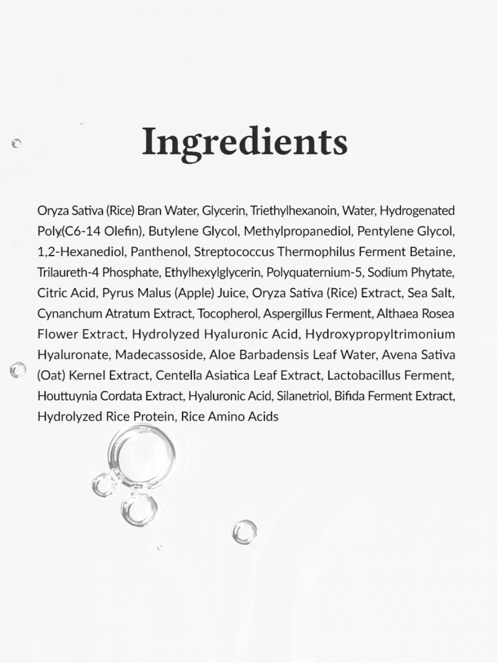 Oryza Sativa (Rice) Bran Water, Glycerin, Triethylhexanoin, Water, Hydrogenated Poly(C6-14 Olefin), Butylene Glycol, Methylpropanediol, Pentylene Glycol, 1,2-Hexanediol, Panthenol, Streptococcus Thermophilus Ferment, Betaine, Trilaureth-4 Phosphate, Ethylhexylglycerin, Polyquaternium-51, Sodium Phytate, Citric Acid, Pyrus Malus (Apple) Juice, Oryza Sativa (Rice) Extract, Sea Salt, Cynanchum Atratum Extract, Tocopherol, Aspergillus Ferment, Althaea Rosea Flower Extract, Hydrolyzed Hyaluronic Acid, Madecassoside, Hydroxypropyltrimonium Hyaluronate, Aloe Barbadensis Leaf Water, Centella Asiatica Leaf Extract, Avena Sativa (Oat) Kernel Extract, Lactobacillus Ferment, Houttuynia Cordata Extract, Hyaluronic Acid, Silanetriol, Bifida Ferment Extract, Hydrolyzed Rice Protein, Rice Amino Acids