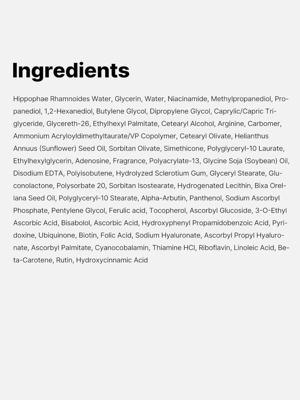 - Benefici per una pelle luminosa: ogni capsula contiene il 50% di acqua di olivello spinoso, il 5% di niacinamide, vitamina C pura e 5 derivati della vitamina C per energizzare e rinfrescare la pelle stanca.